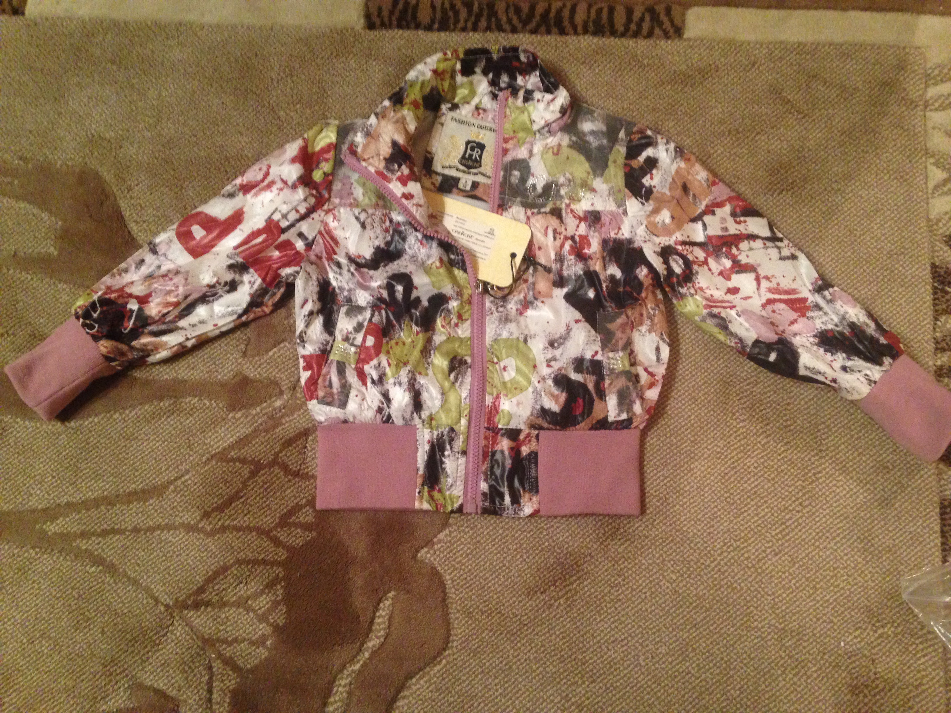 Модная ветровка с капюшоном и ярким принтом для современных девочек. Воротник стойка защитит от ветра. Украшена стразами. Кратко -офигенная!